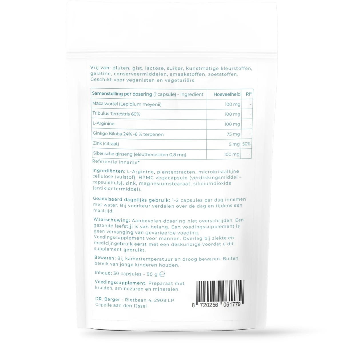Ingrediënten: L-Arginine, plantextracten, microkristallijne cellulose (vulstof), HPMC vegacapsule (verdikkingsmiddel – capsulehuls), zink, magnesiumstearaat, siliciumdioxide (antiklontermiddel).